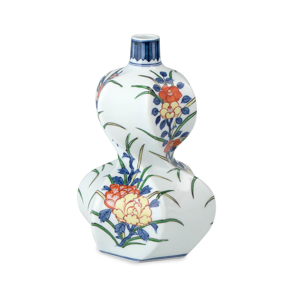 画面全体に様々な草花をモチーフに、繊細に描いた花瓶です。 存在感のある瓢型で、お部屋のワンポイントアクセントとしてお楽しみください。 ・木箱入