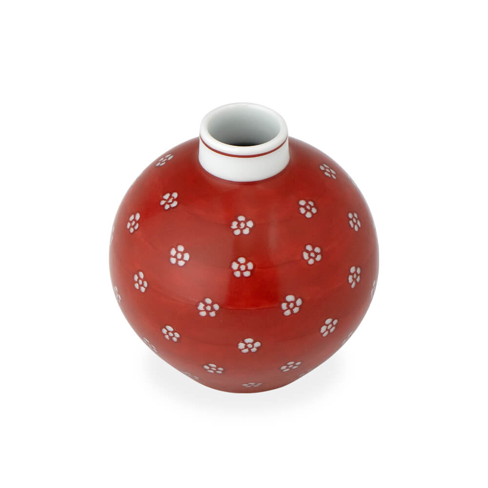 赤絵梅地紋(あかえうめじもん) 吉祥紋である梅の花を小紋風に表わした文様。有田和絵具の「花赤」で描かれた自然の赤が鮮やかです。