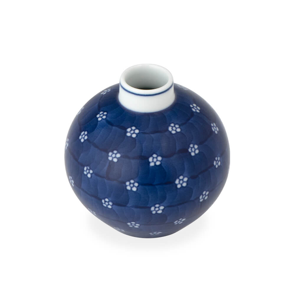 染付梅地紋(そめつけうめじもん) 厳冬の中で百花に先駆けて蕾をほころばす梅。縁起の良い花として、古来松竹とともに広く膾炙されてきた梅の花を、小紋柄として描いた文様です。渋好みな質実さのなかにも素朴な愛らしさがあり、老若男女を問わず人気の文様です。