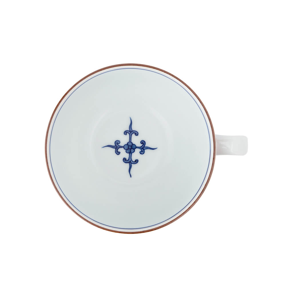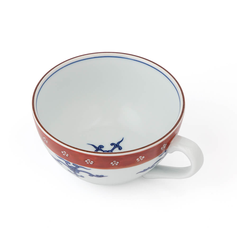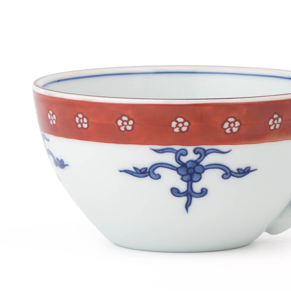この唐草文様を流麗な筆使いの染付けで、胴の四方と見込み(茶溜り)に描いたスープ碗です。口縁には、縁起の良い梅の花を、帯状の赤絵小紋柄で描きました。伝統の唐草文と梅文が融合し、紺と朱が白磁に映えるスープ碗は、自家用としてもギフト用としても人気を集めています。