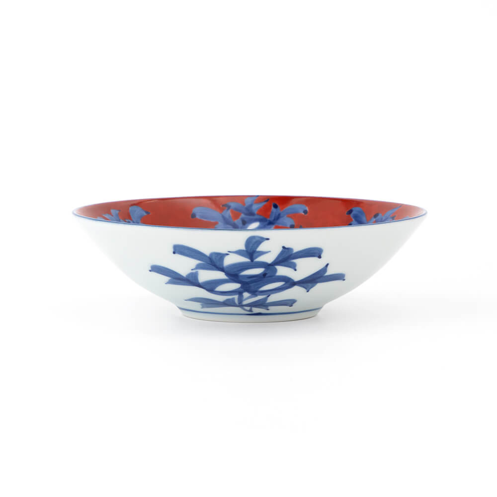 赤濃牡丹絵(あかだみぼたんえ) 思い切りのよい筆使いが魅力の赤濃の鉢。天然の材料からなる有田和絵具の赤は、自身存在感がありながら、食材の色味とも不思議に調和します。煮魚から根菜などの煮物、和え物まで、何を盛っても食材とともに食卓にパッと映える器です。 サラダの取り皿などにもちょうど良いサイズ。多用途で、使い込むほどに愛着の湧く普段使いの良品です。