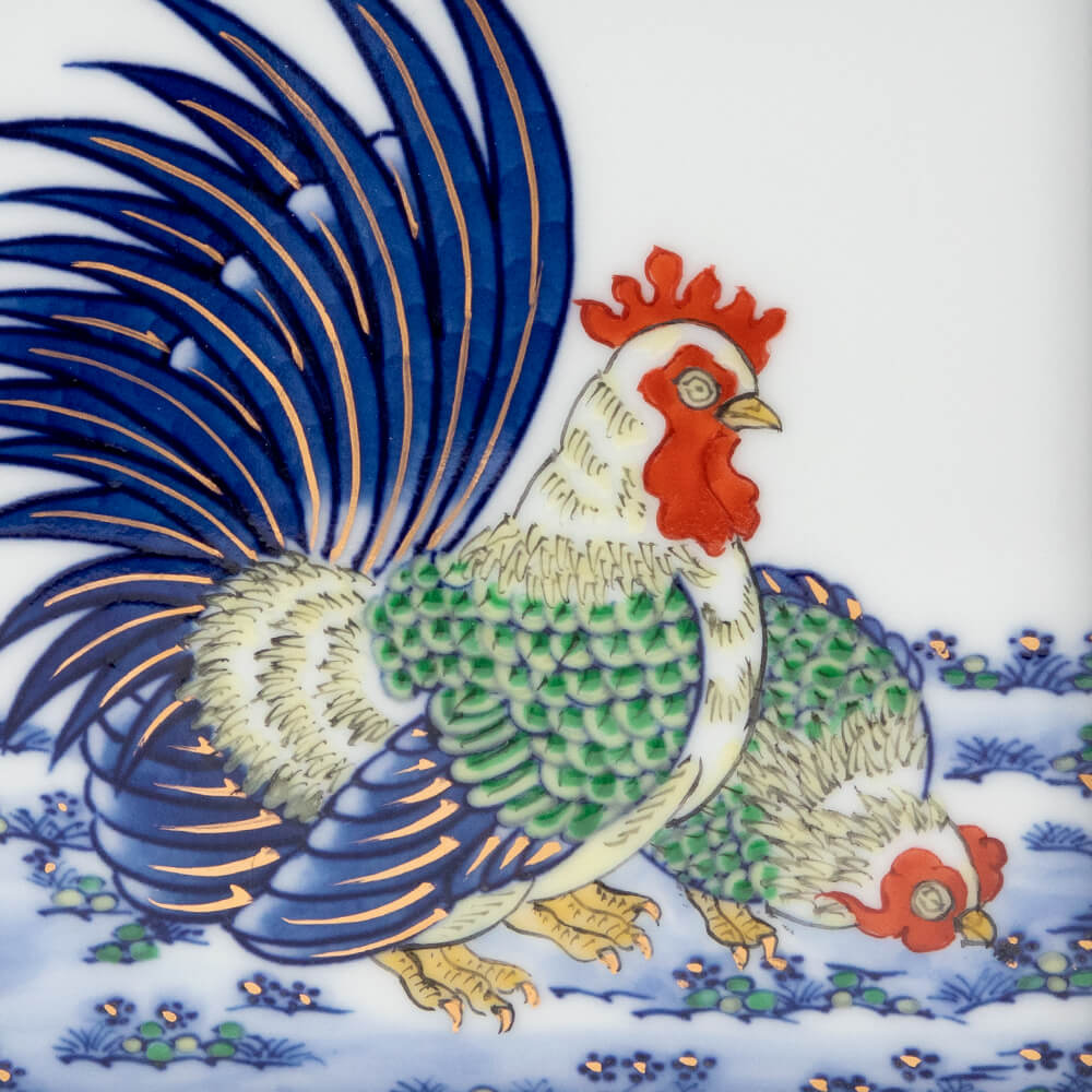 この、めでたき鶏を画題として、華麗な色彩の染錦で描いたミニ陶額です。スタンド付きの小さな卓上タイプで場所をとらず、仲睦まじい、つがいの鶏は季節を問わず飾ることができます。額は重厚な材質で安定感があり、自家用はもちろん、結婚祝いなど慶事の贈り物しても最適です。