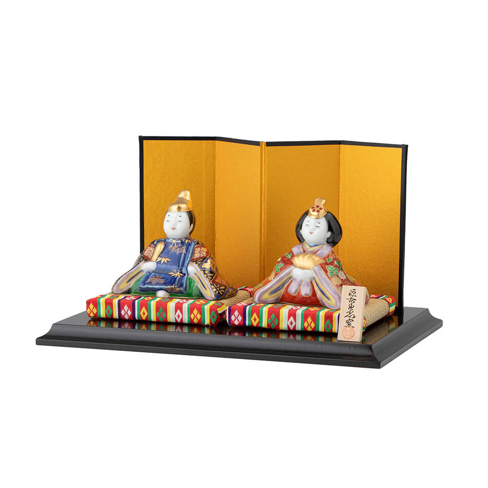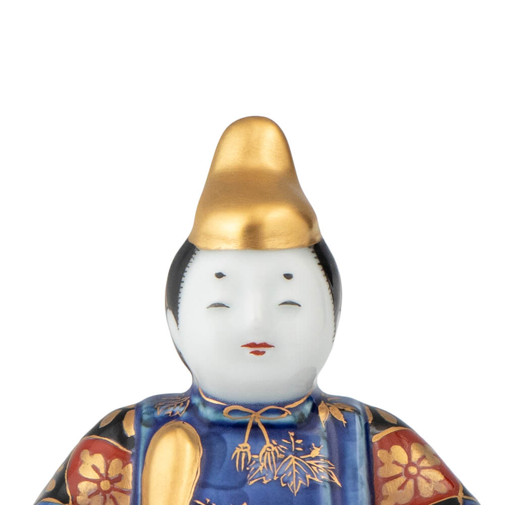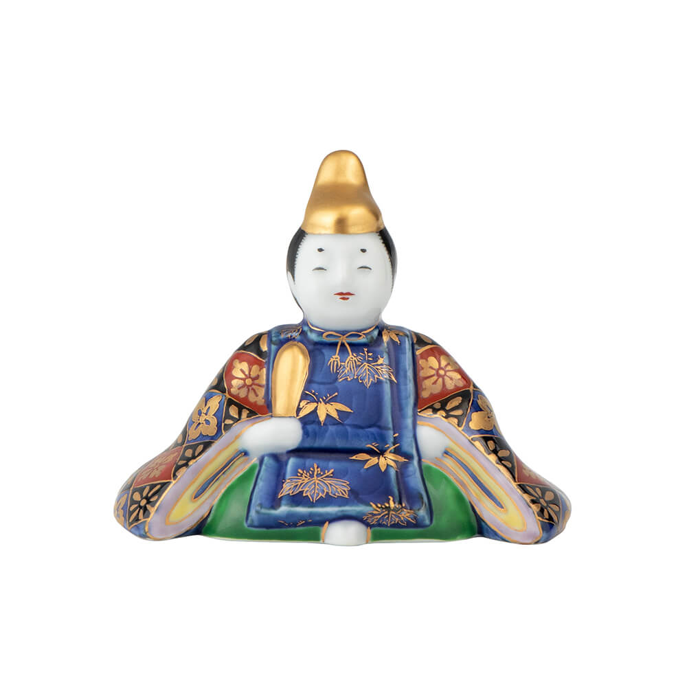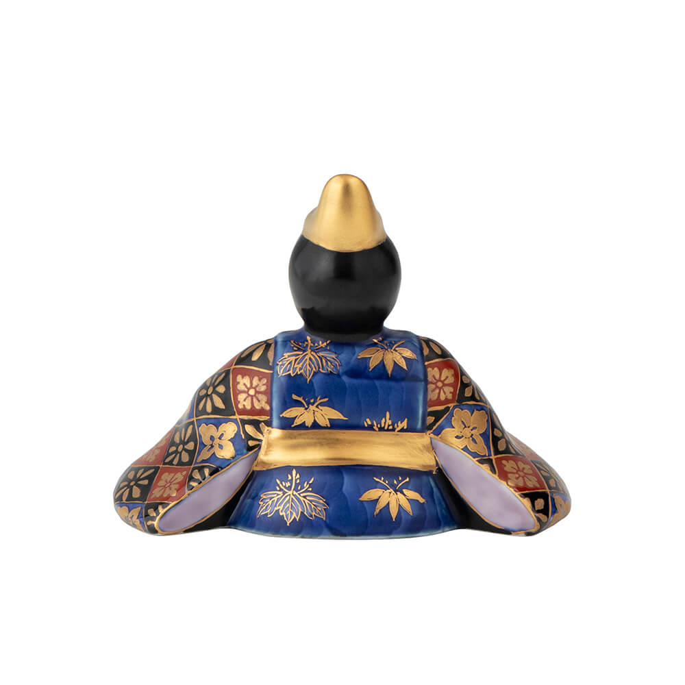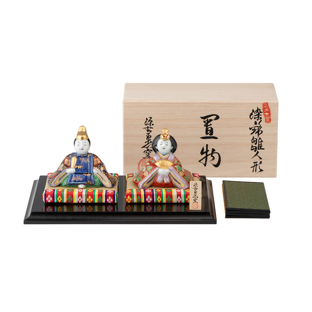染錦座り雛(菊)は、好評をいただく磁器製雛の第2弾として、新たに原型をおこした座り雛で、衣装の文様には平安時以来、貴族や公家のあいだで調度や装束に用いられてきた日本古来の有職文様(ゆうそくもんよう)を緻密に描き、愛らしさのなかに伝統美を表現しました。