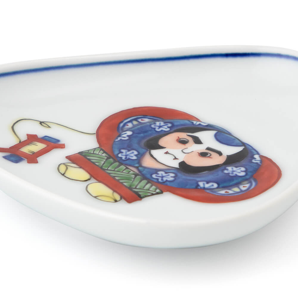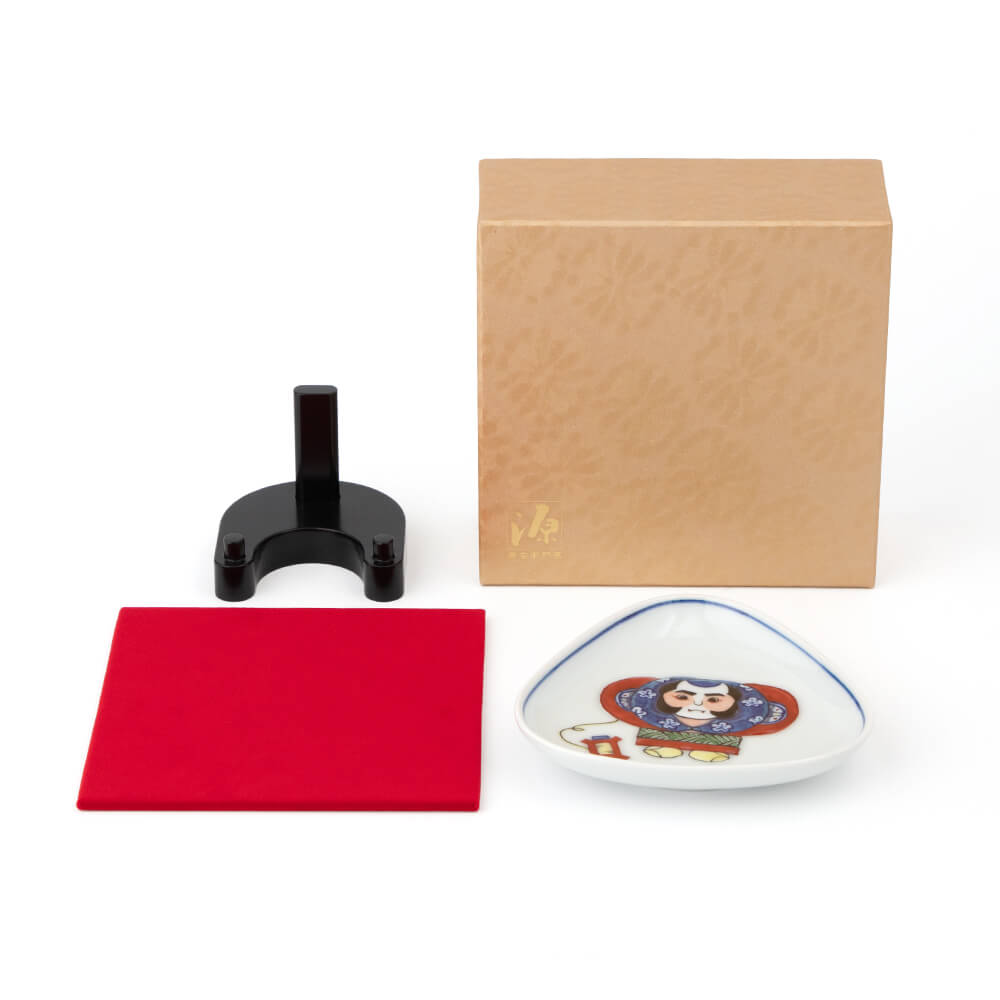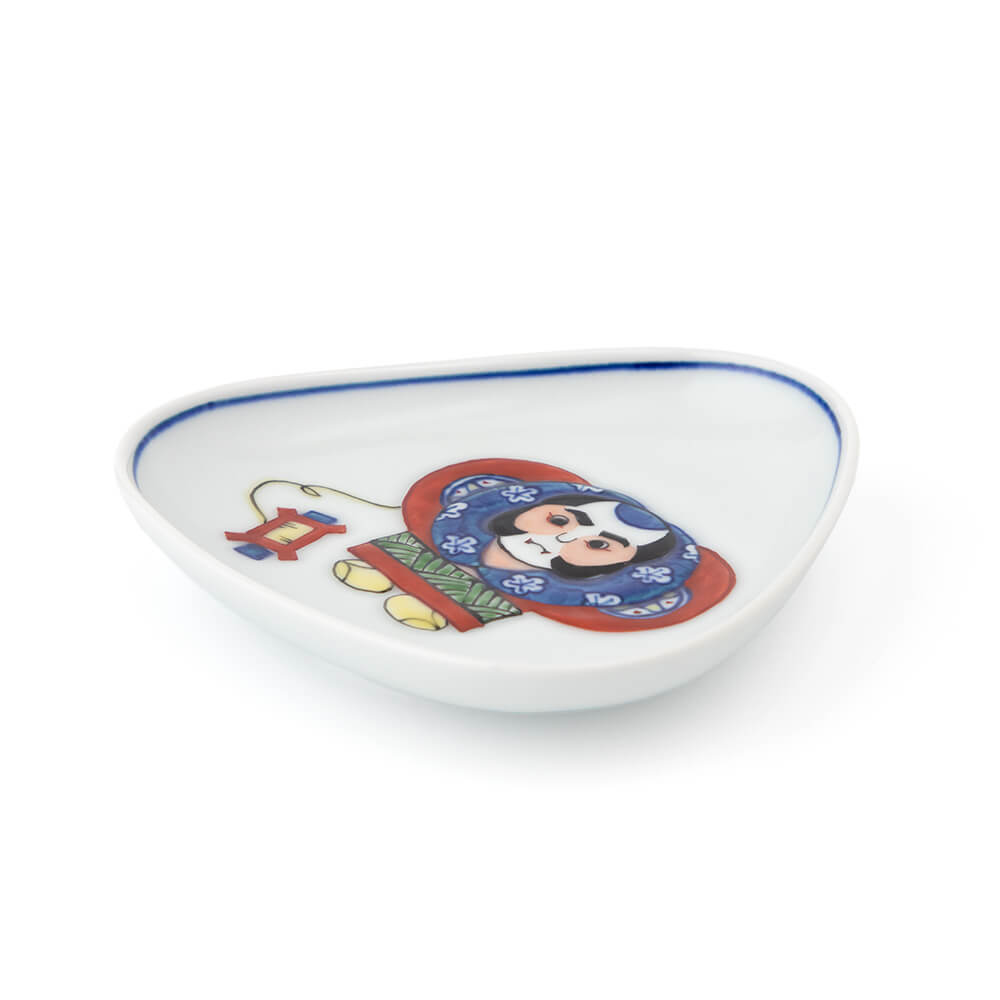 つめたい冬の風に乗って大空に舞いあがる初凧は、新年ならではの風物詩で、俳句の季語にもなっています。絵柄は江戸時代に武家につかえていた奴(やっこ)で、威勢のいい粋な筒袖姿を可愛い三角形の小皿に、色鮮やかな染錦で描きました。