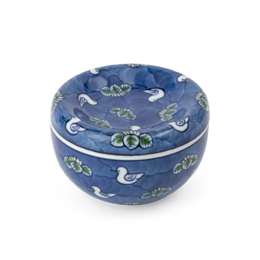 染錦水鳥図(そめにしきみずとりず) かわいい水鳥と桐紋を交互にあしらった蓋物です。源右衛門窯を代表する文様の一つで、染濃(そめだみ)で描いた水面で水鳥たちが楽しく遊び、のびやかな雰囲気をただよわせます。 また、ピタリとはまる蓋が、窯の高度な伝統技法をさりげなく語りかけます。愛らしく落ち着いた雰囲気でジャム入れなどとして、用途も多彩。末永くご愛用いただける蓋物として、自家用にも贈り物にもぴったりな逸品です。