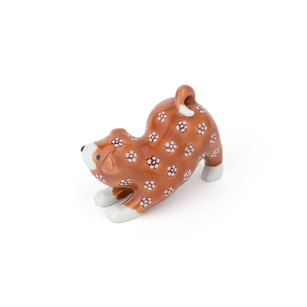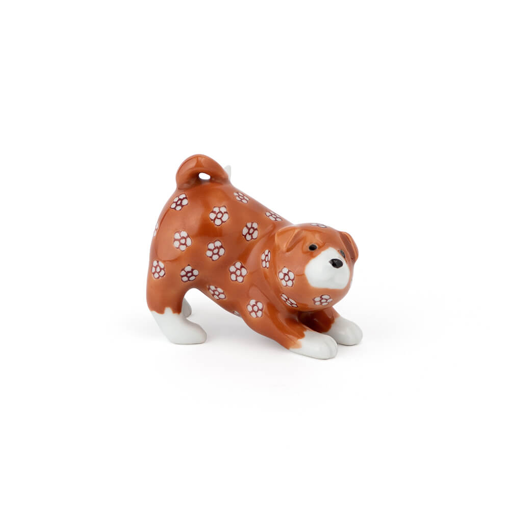 飼い主によくなつくペットとして、家族の一員として愛され、また、お産が軽いことから安産の守り神とされてきました。その大切な犬が一緒に遊んでもらいたがったり、散歩をせがむかわいい姿をかたどり、人気の伝統文様「梅地紋」で彩った置物です。