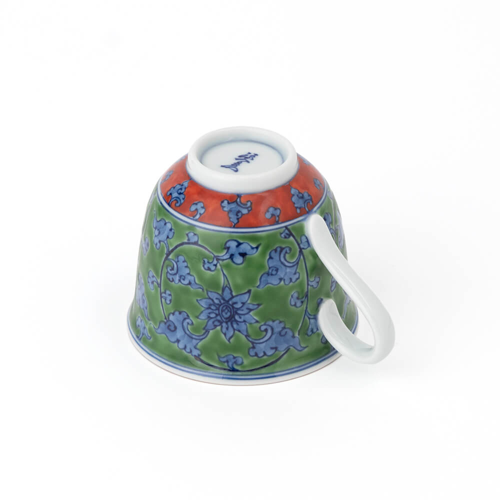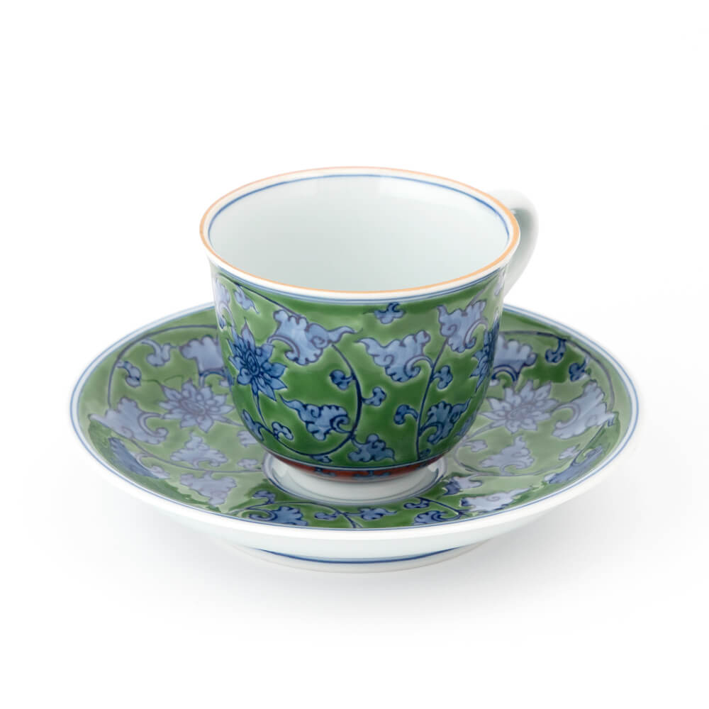緑彩唐草(りょくさいからくさ) 染付で描いた細かい唐草の地の部分を、緑の上絵で時間をかけて塗り込めた、緑彩唐草の碗皿です。丹念でいて大胆さを失わない上絵の筆づかいが、上品さのなかにも源右衛門窯らしいおおらかさを醸しだします。ちょっと贅沢な日常使いのティーカップとして、来客のおもてなし用として、また、大切な方への贈物としても最適な、とても個性的でエキゾチックな逸品です。