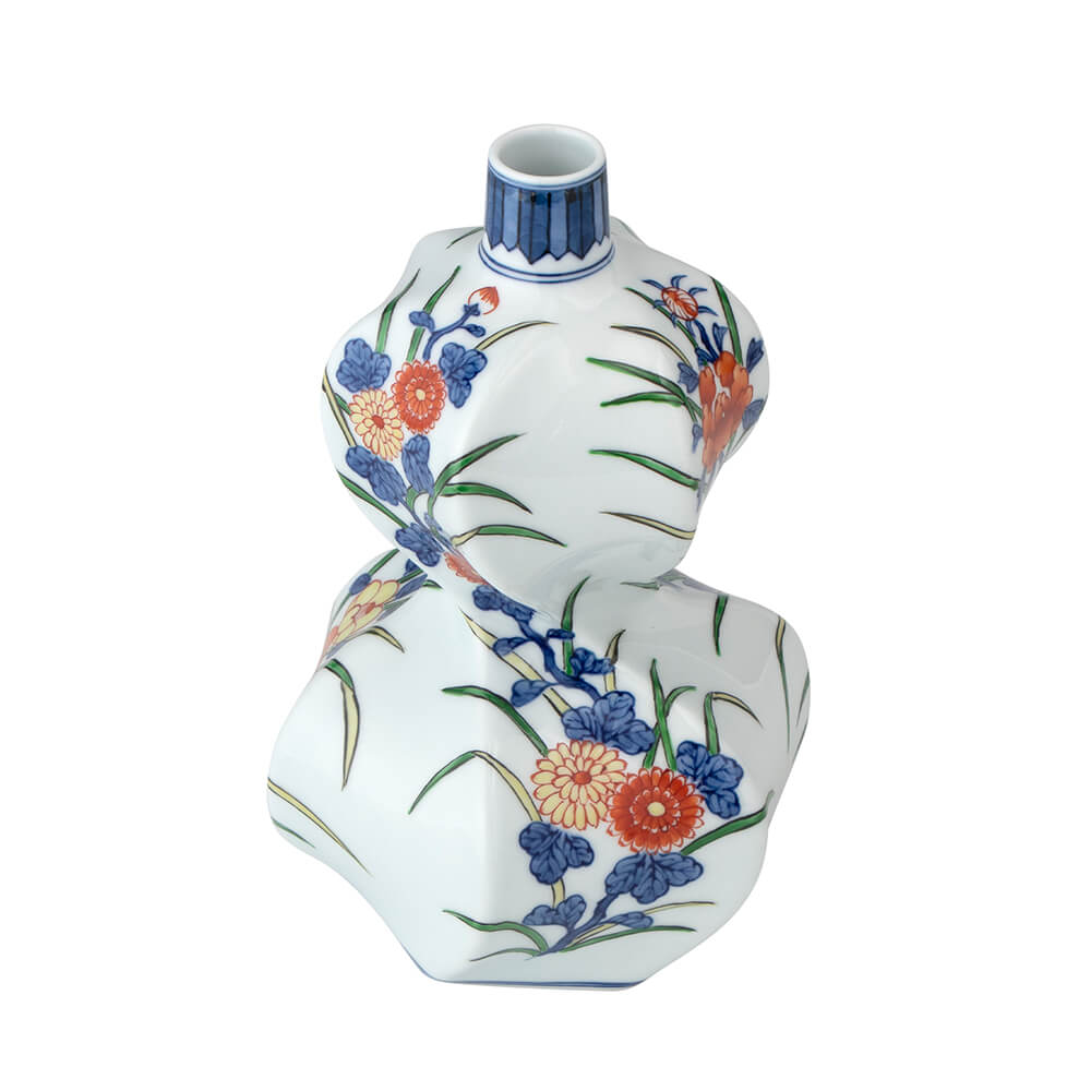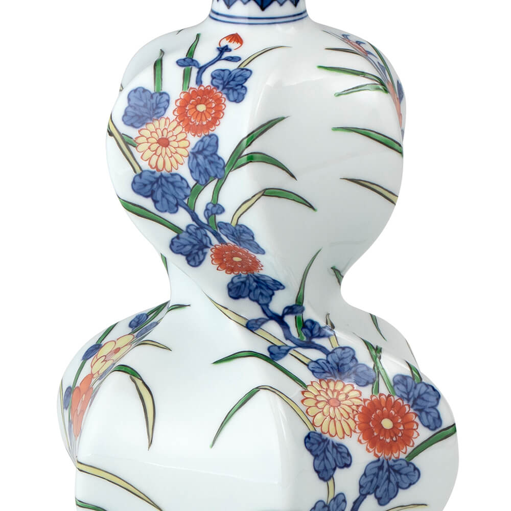 画面全体に様々な草花をモチーフに、繊細に描いた花瓶です。 存在感のある瓢型で、お部屋のワンポイントアクセントとしてお楽しみください。 ・木箱入