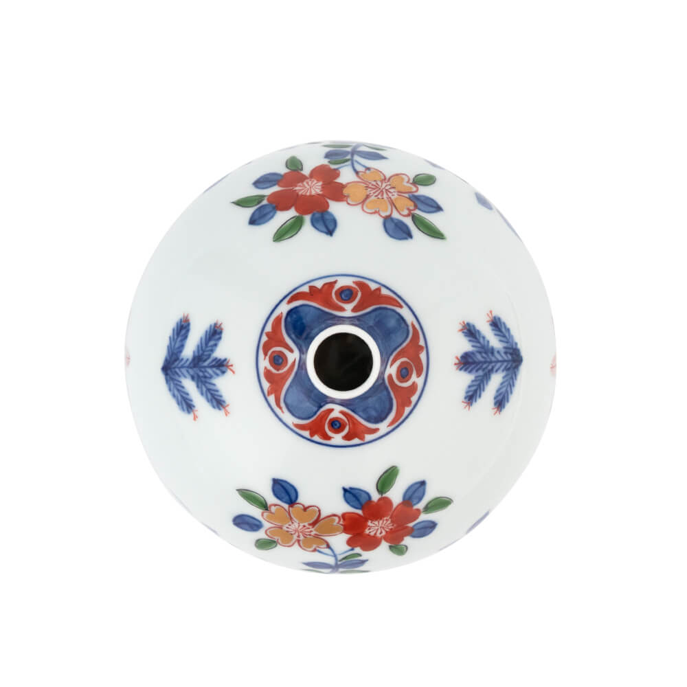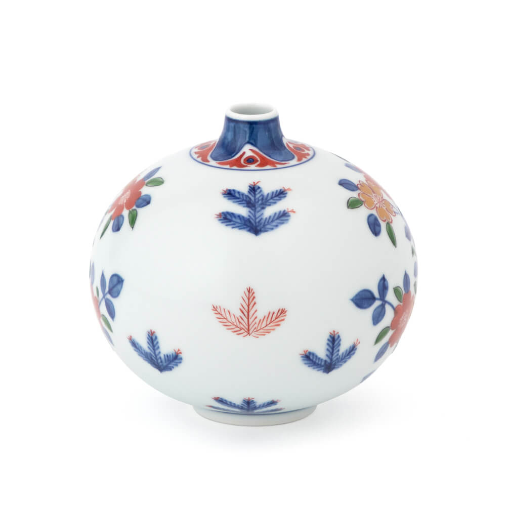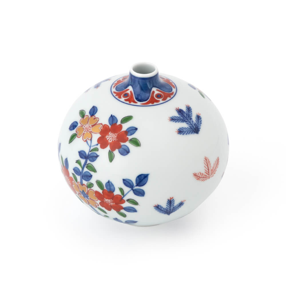 古伊万里風桜図(こいまりふうさくらず) 愛らしくも生命力あふれる葉桜を、染錦の技法を凝らして描いた花瓶。かつて世界中の人々を魅了した古伊万里風の華やかさで、染付の藍、花赤、緑、金と、源右衛門窯がこだわる4つの色彩を一手にお楽しみいただけます。