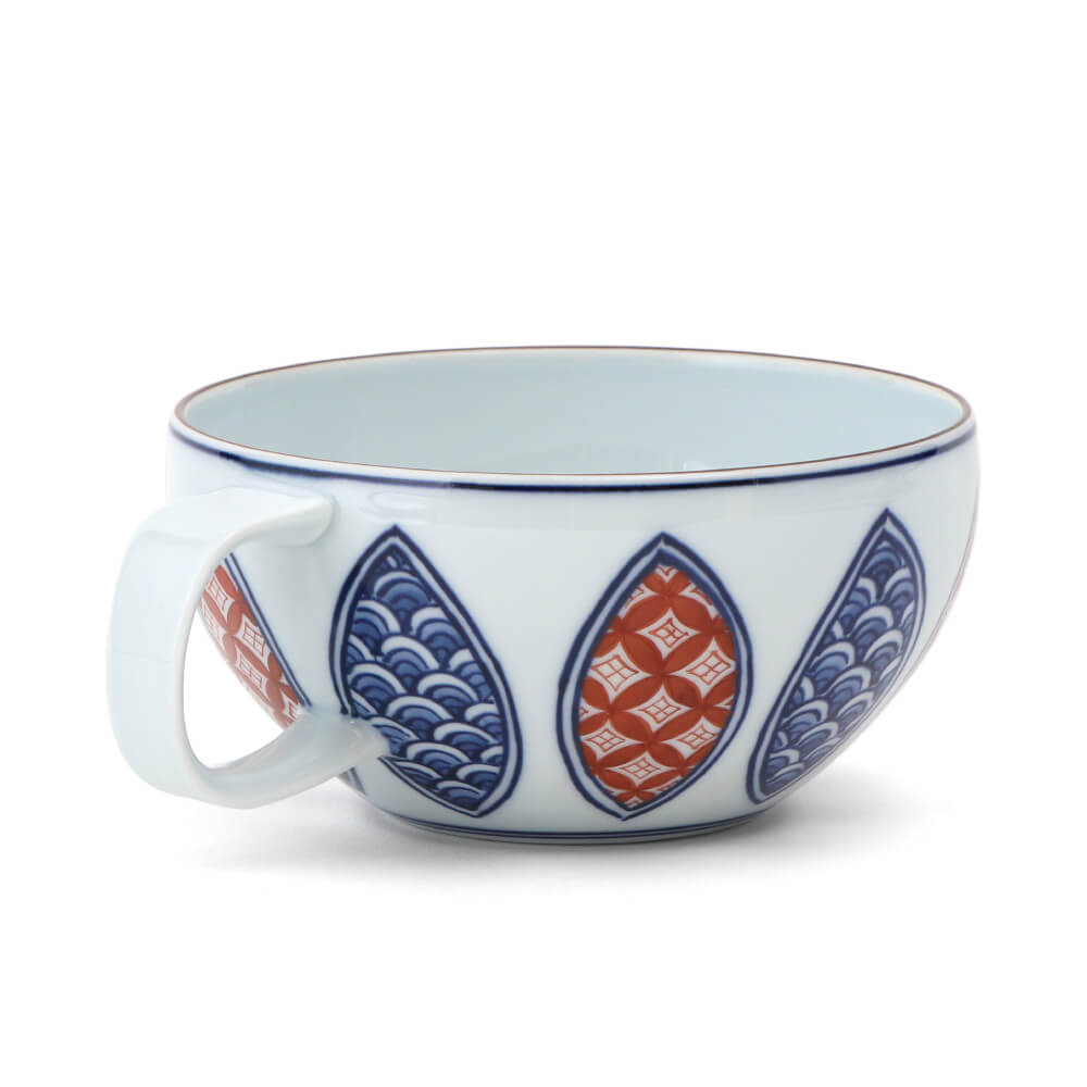 源右衛門窯の製品の中では比較的新しい絵柄ですが、早くも好評をいただいている「波七宝文シリーズ」。当オンラインショップに初登場です。 染付と上絵の赤だけで表現した波文と七宝文がすっきりとした印象を与えます。 丸みを帯びたフォルムにシャープな取っ手が印象的なスープ碗。 スープカップとしてはもちろん、カフェオレボウルやシリアルボールとしても活躍してくれそうです。