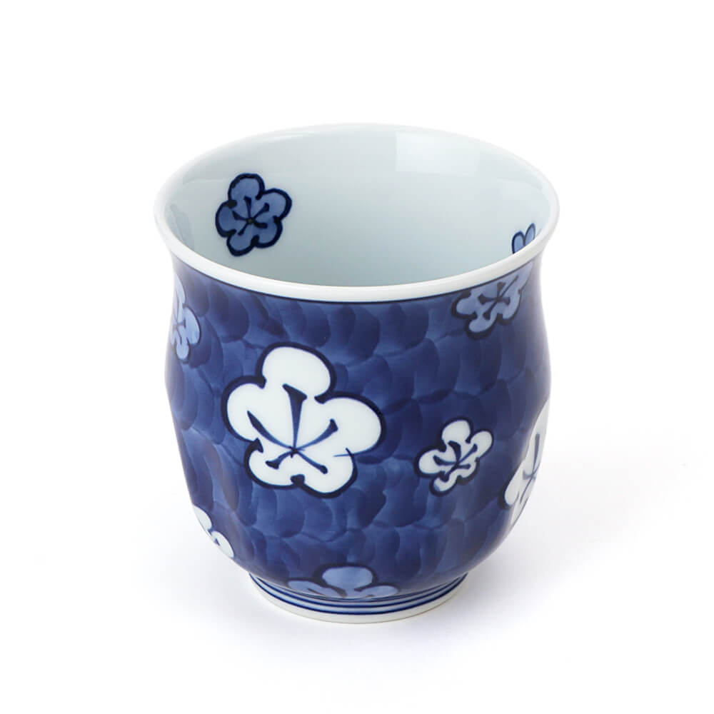 この伝統文様を、源右衛門窯独自の染付濃(だみ)で白磁に浮き上がらせた「古染風梅づくし 湯呑」です。大きさも色も異なるたくさんの梅花が風に舞うように、見込みにまでリズミカルに描かれています。