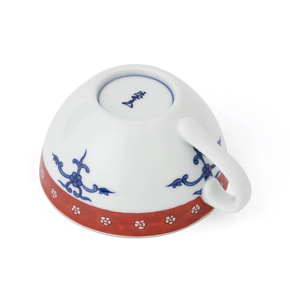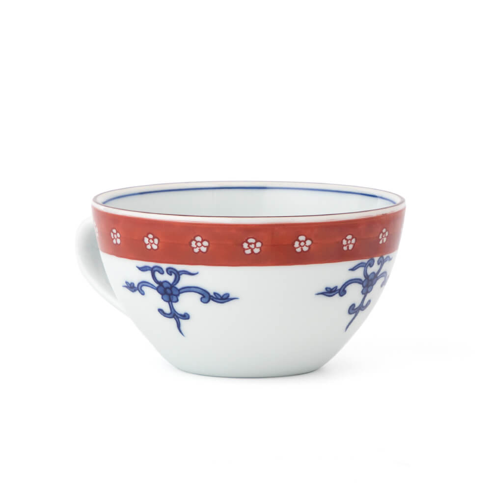 この唐草文様を流麗な筆使いの染付けで、胴の四方と見込み(茶溜り)に描いたスープ碗です。口縁には、縁起の良い梅の花を、帯状の赤絵小紋柄で描きました。伝統の唐草文と梅文が融合し、紺と朱が白磁に映えるスープ碗は、自家用としてもギフト用としても人気を集めています。
