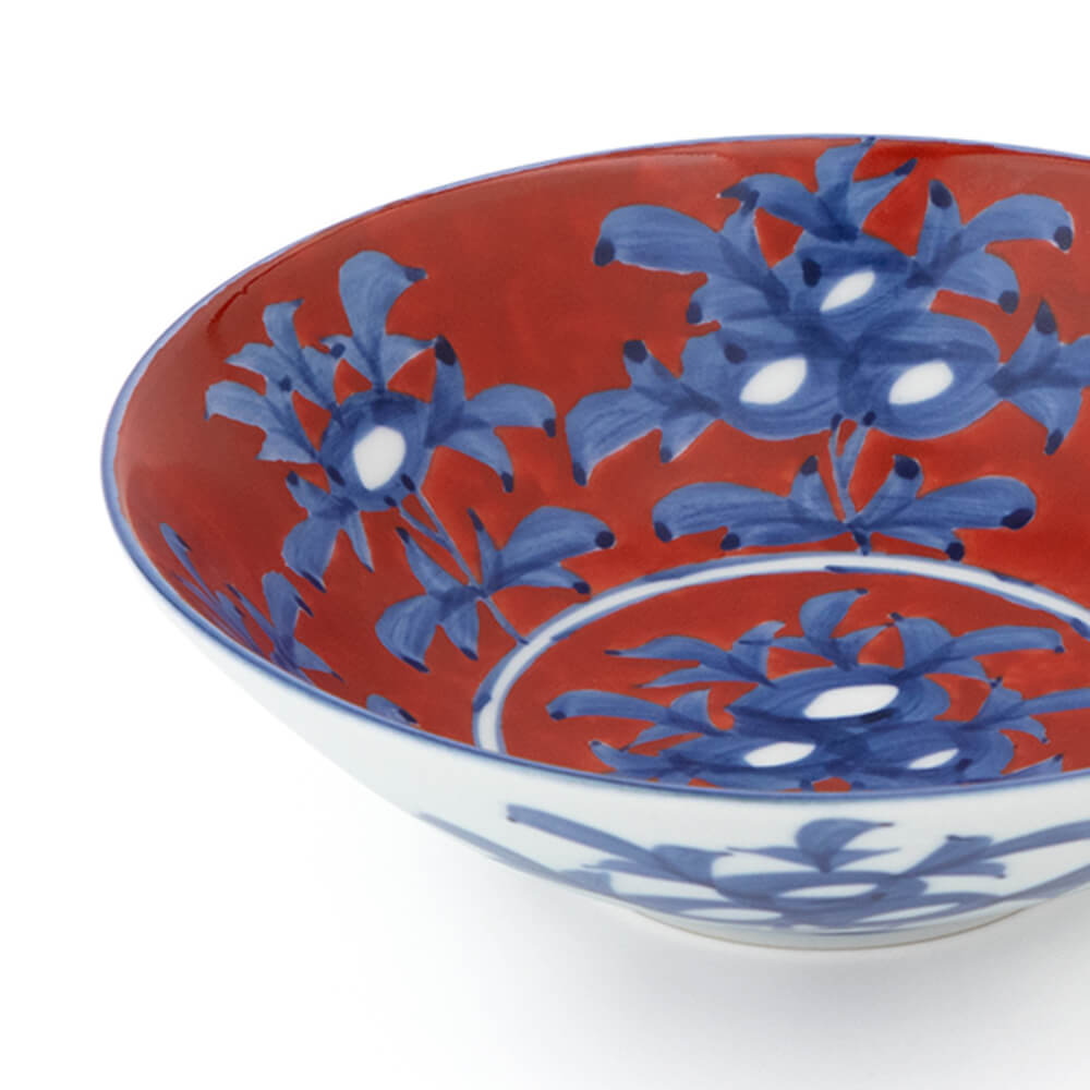 赤濃牡丹絵(あかだみぼたんえ) 思い切りのよい筆使いが魅力の赤濃の鉢。天然の材料からなる有田和絵具の赤は、自身存在感がありながら、食材の色味とも不思議に調和します。煮魚から根菜などの煮物、和え物まで、何を盛っても食材とともに食卓にパッと映える器です。 サラダの取り皿などにもちょうど良いサイズ。多用途で、使い込むほどに愛着の湧く普段使いの良品です。