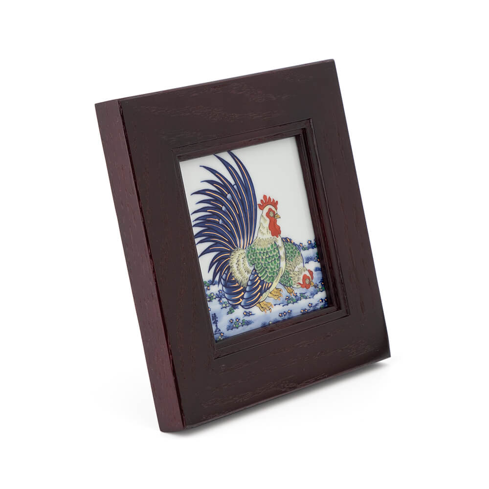 この、めでたき鶏を画題として、華麗な色彩の染錦で描いたミニ陶額です。スタンド付きの小さな卓上タイプで場所をとらず、仲睦まじい、つがいの鶏は季節を問わず飾ることができます。額は重厚な材質で安定感があり、自家用はもちろん、結婚祝いなど慶事の贈り物しても最適です。