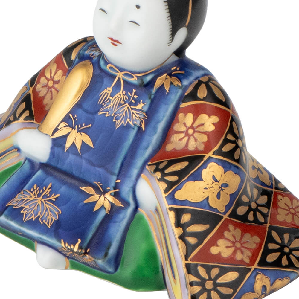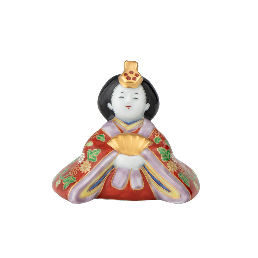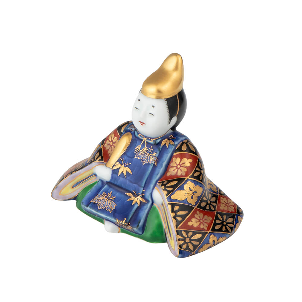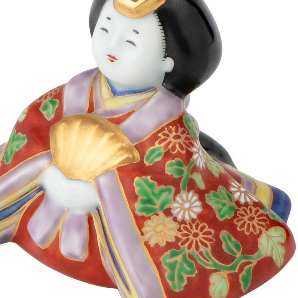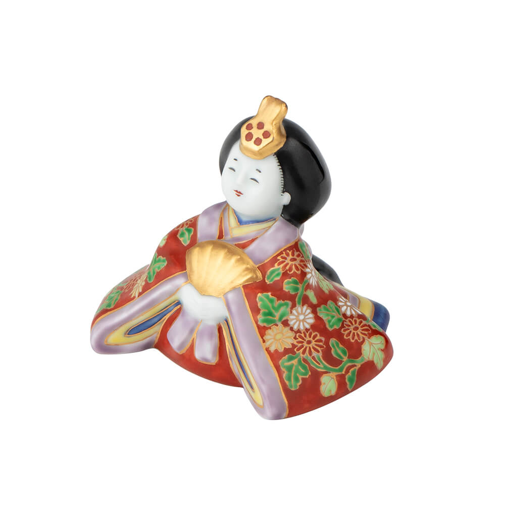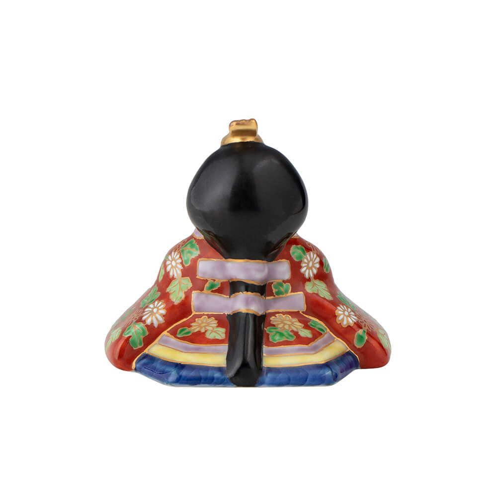 染錦座り雛(菊)は、好評をいただく磁器製雛の第2弾として、新たに原型をおこした座り雛で、衣装の文様には平安時以来、貴族や公家のあいだで調度や装束に用いられてきた日本古来の有職文様(ゆうそくもんよう)を緻密に描き、愛らしさのなかに伝統美を表現しました。