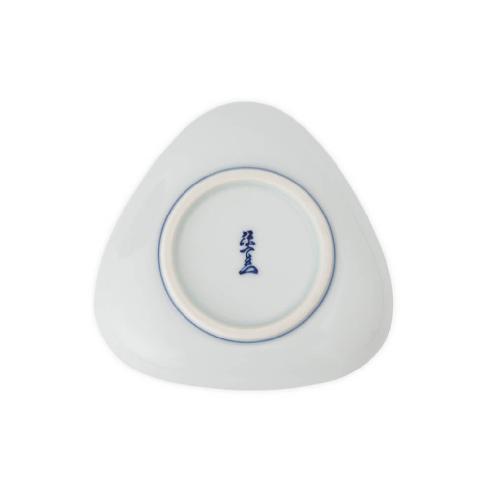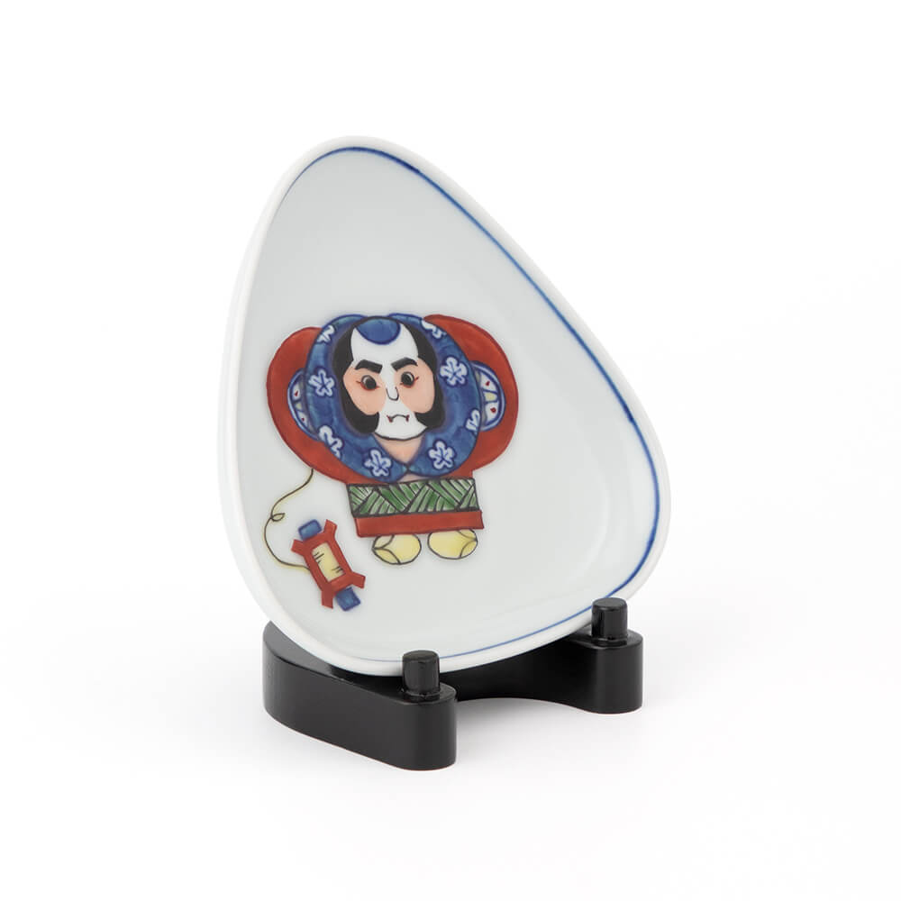 つめたい冬の風に乗って大空に舞いあがる初凧は、新年ならではの風物詩で、俳句の季語にもなっています。絵柄は江戸時代に武家につかえていた奴(やっこ)で、威勢のいい粋な筒袖姿を可愛い三角形の小皿に、色鮮やかな染錦で描きました。