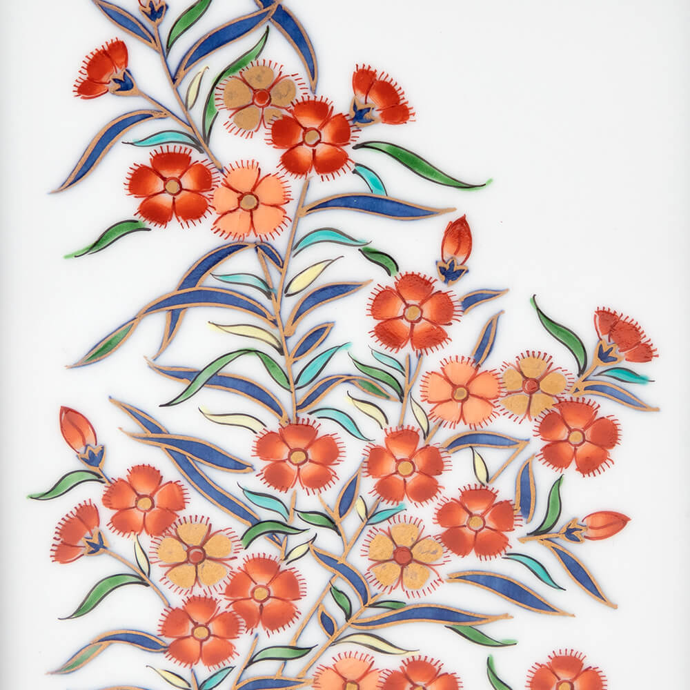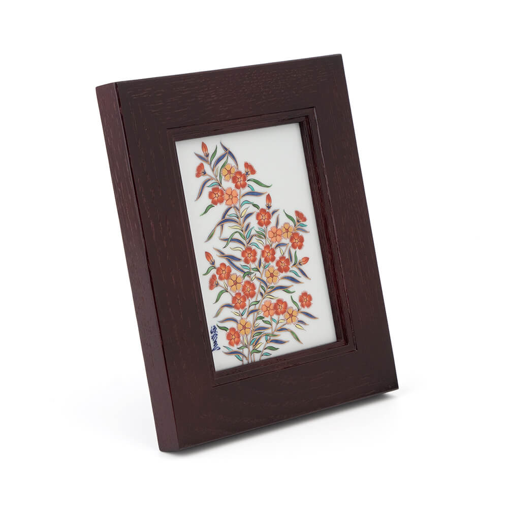 うららかな日和のつづく卯月(4月)、春の日本の庭や野を彩る撫子を、目に鮮やかな色使いで描いた陶画歳時記です。