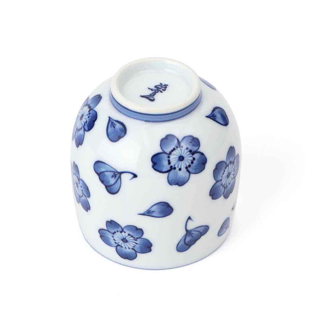 染付桜花文(そめつけおうかもん) 春の訪れとともに山野を染めて花開き、惜しまれて風に散る風情がこよなく愛される桜は、古来よりわが国で、花の代名詞となるほどに親しまれてきました。花びらを文様化した桜花紋は、金工、漆工芸、木工芸、染織、絵画、陶磁器とあらゆる分野に用いられてきました。その伝統文様を、源右衛門窯独自の染付でくっきりと描いた湯呑です。 持ちやすい形状の湯呑は、使いこむほどに手に馴染み、呉須で描かれたブルーの桜花文が、お茶を楽しむひとときに落ち着きと安らぎを添えてくれます。