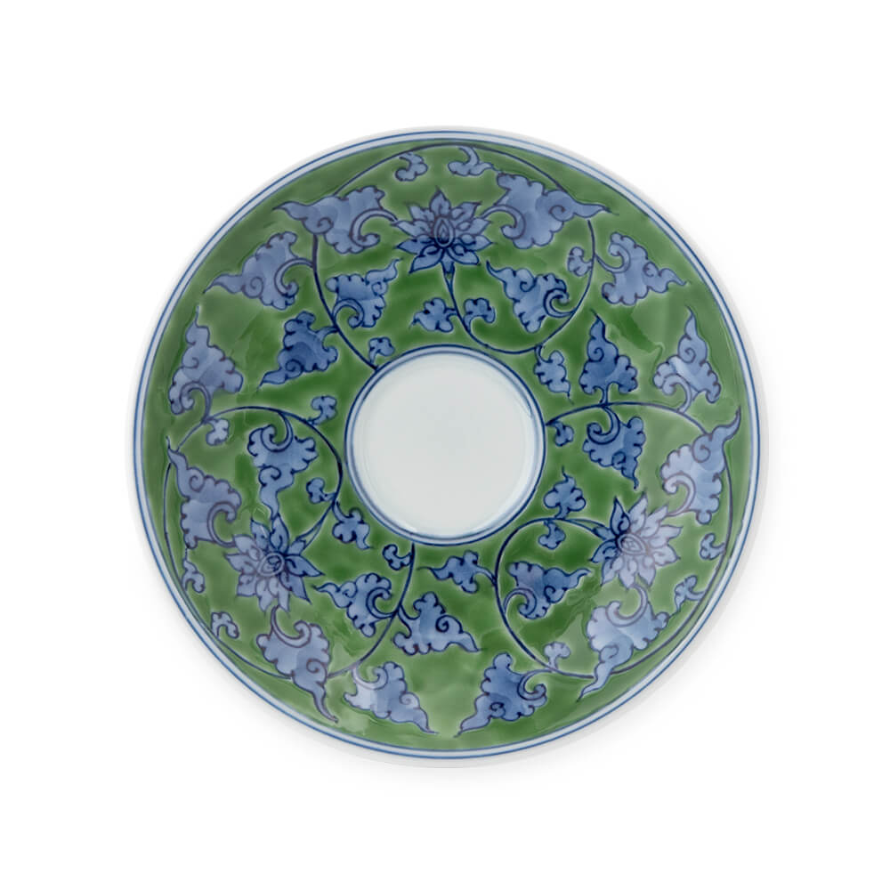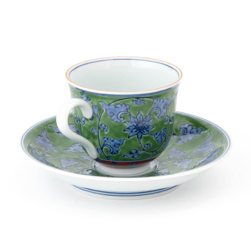 緑彩唐草(りょくさいからくさ) 染付で描いた細かい唐草の地の部分を、緑の上絵で時間をかけて塗り込めた、緑彩唐草の碗皿です。丹念でいて大胆さを失わない上絵の筆づかいが、上品さのなかにも源右衛門窯らしいおおらかさを醸しだします。ちょっと贅沢な日常使いのティーカップとして、来客のおもてなし用として、また、大切な方への贈物としても最適な、とても個性的でエキゾチックな逸品です。